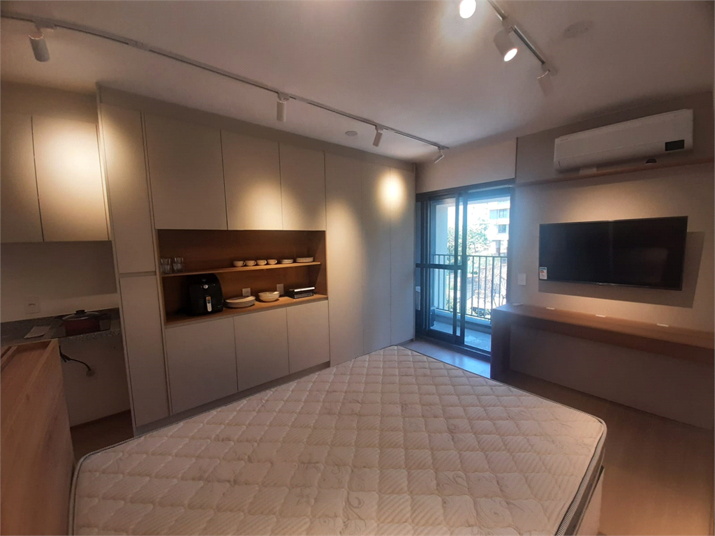 Studio 36 m2 com varanda, todo mobiliado com excelentes armários planejados, eletrodomésticos, ar-condicionado, projeto luminotécnico e 1 vaga de garagem.