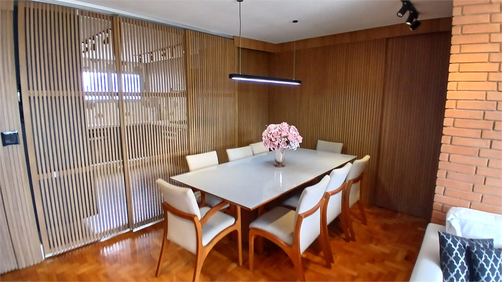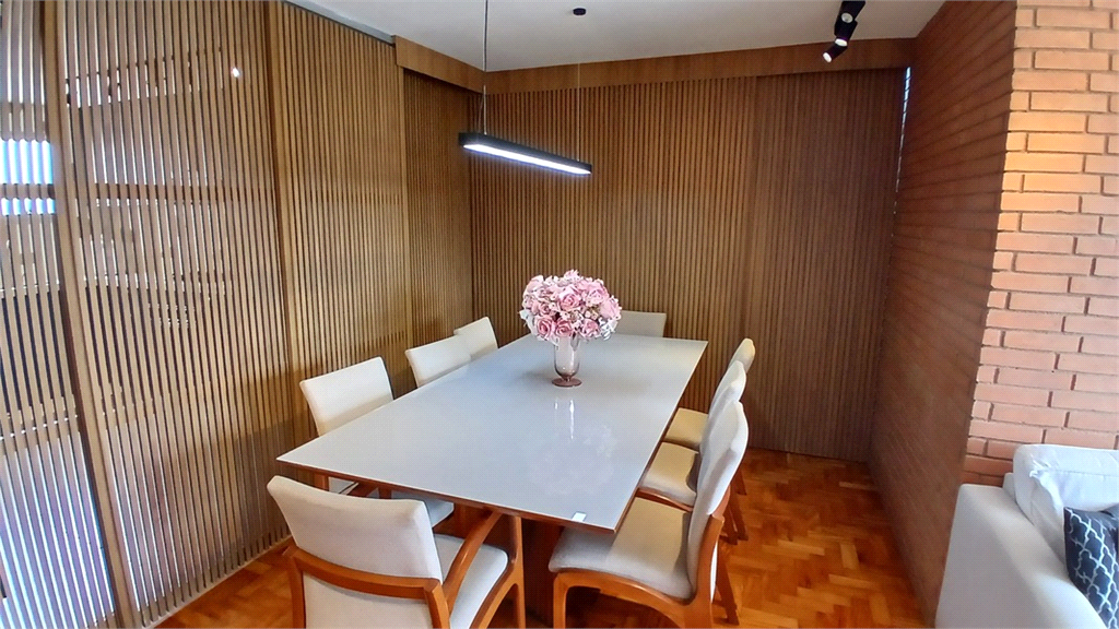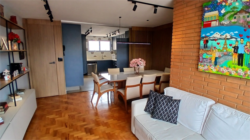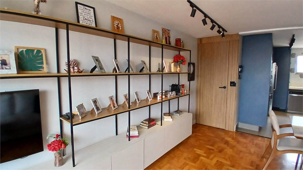 - Sala integrada com a cozinha, com portas de correr em treliça, isolando o ambiente tanto da cozinha como dos quartos.