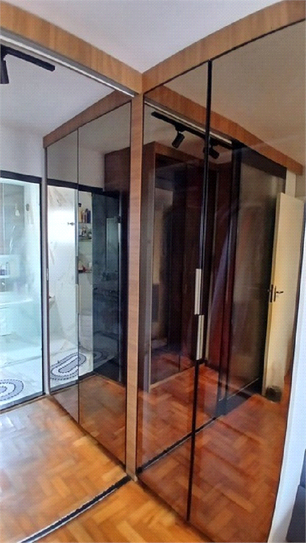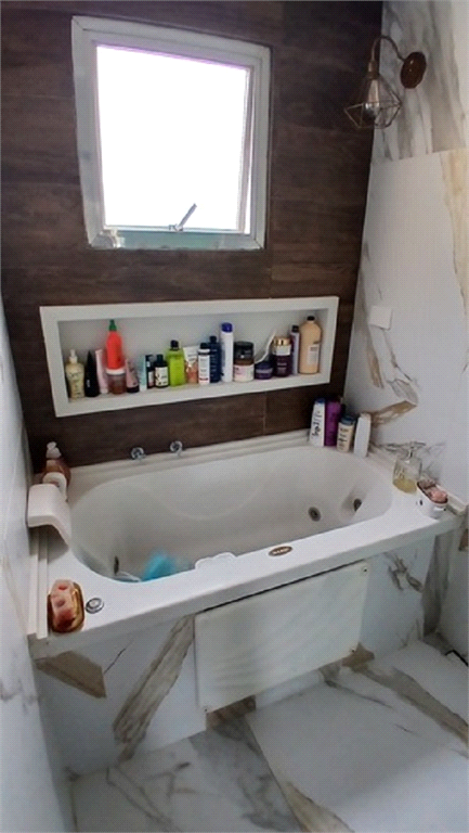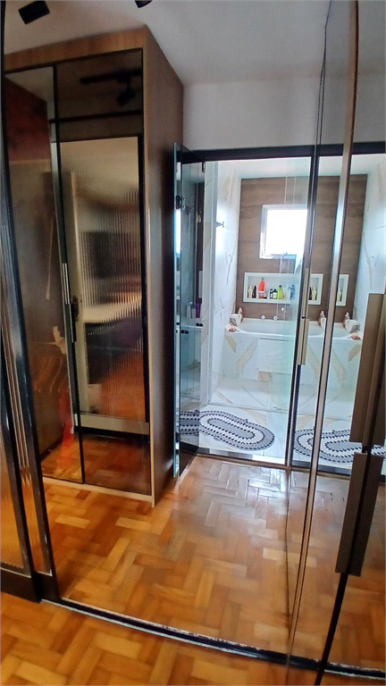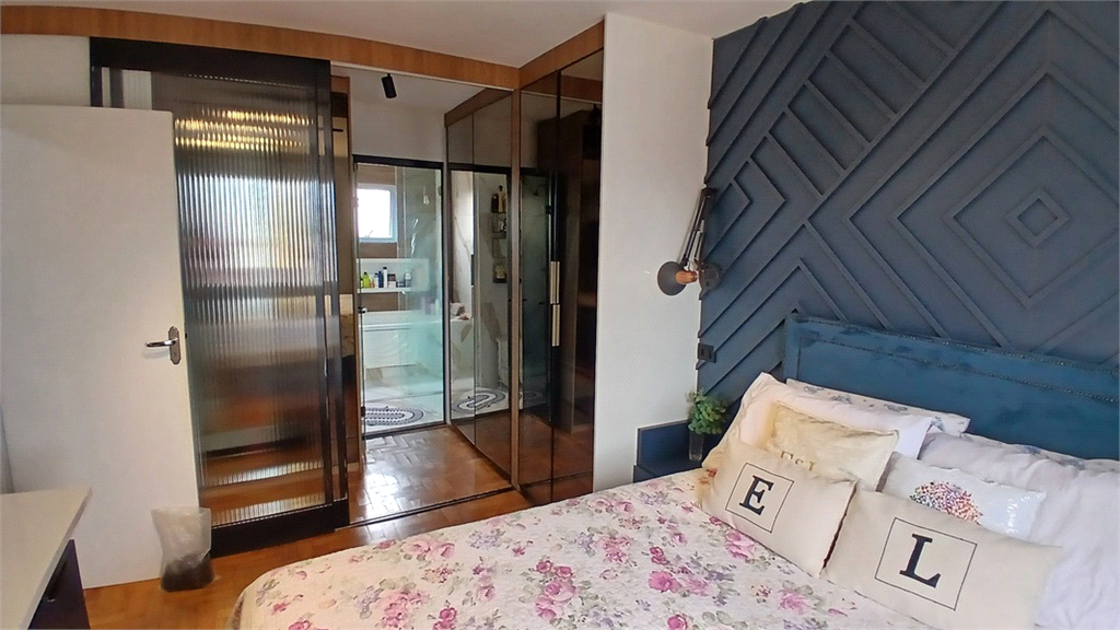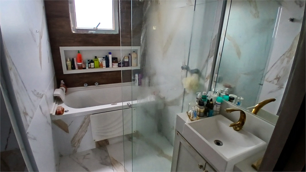 - Quarto principal revertido para suíte master, tento closet com portas em vidro semi-espelhado, painéis em madeira e console, além de wc com banheira de hidro, box em vidro e balcão com cuba suspensa.
