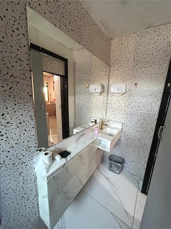 Banheiro com pia planejada em porcelanato marmorizado, box de vidro e espelho grande, oferecendo conforto e sofisticação