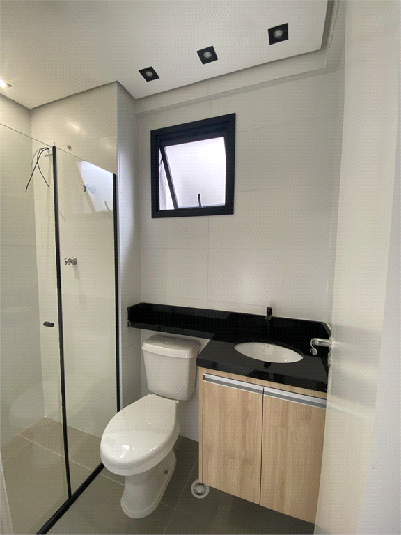Banheiro com ventilação natural, chuveiro Elétrico instalado, box de vidro e espelho e armário, unindo funcionalidade e design.